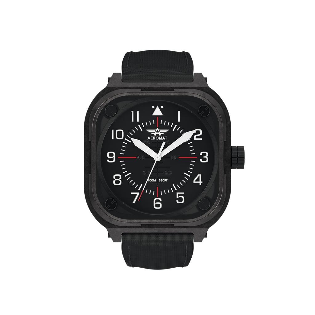 The AEM 450 Carbon shows off a stylish look with its matt black dial that sits on a carbon fiber based case and stainless steel bezel. Its hands and indexes are filled with white lum. It also features a black canvas bracelet for a more casual look that you can wear anywhere.